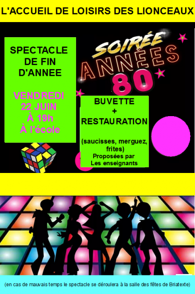 ven 22/06/2018 - 19:00 Centre de Loisirs Les Lionceaux Spectacle organisé par l'accueil de Loisirs Les Lionceaux Buvette tenue par l'association des parents d'élèves. En cas de mauvais temps le spectacle sera transféré à la salle des fêtes